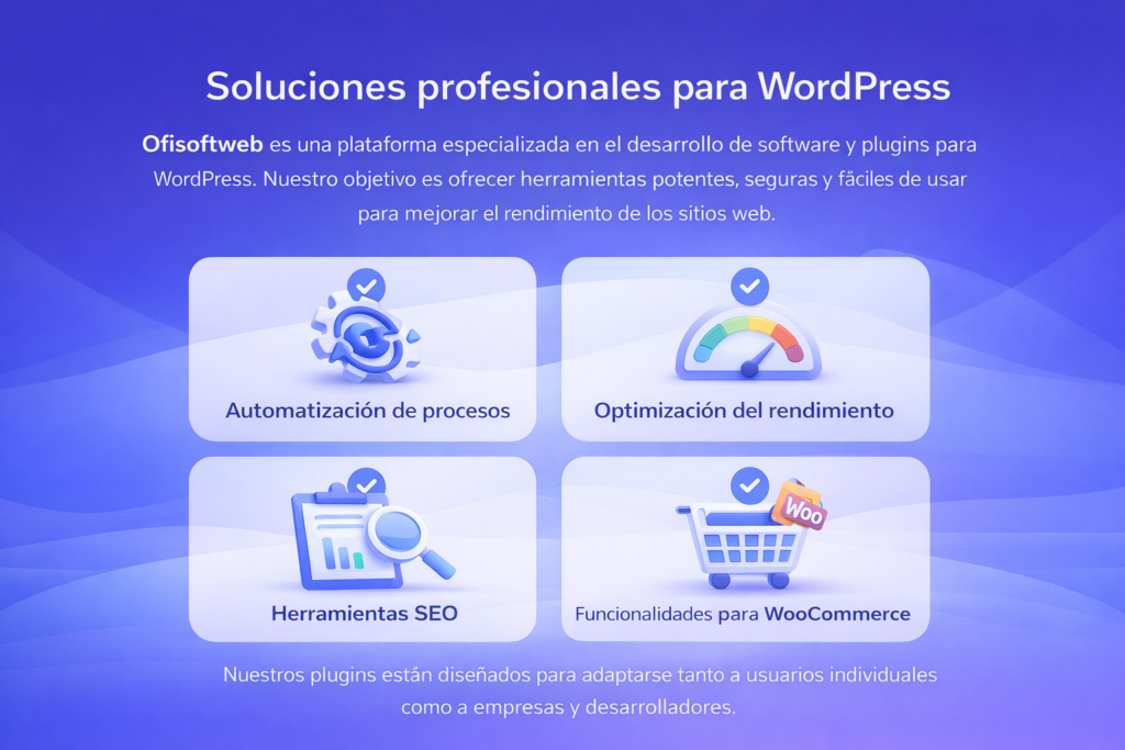 En Ofisoftweb desarrollamos plugins y soluciones profesionales para WordPress diseñadas para mejorar el rendimiento, la automatización y la gestión de tu sitio web.